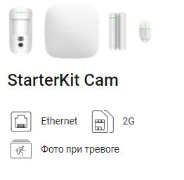 Ajax StarterKit Cam (white) Комплект радиоканальной системы безопасности с фотоверификацией тревог в составе: "Ajax Hub 2" - 1 шт., централь с фотоверификацией тревог, до 100 радиоустройств, GSM-коммуникатор (2G), 2 SIM карты, Ethernet; "Ajax MotionCam" - 1 шт., внутренний датчик движения с фотокамерой для верификации тревог; "Ajax DoorProtect" - 1 шт., датчик открытия двери/окна; "Ajax SpaceControl" - 1 шт., брелок управления 4-х кнопочный. Все устройства белого цвета.