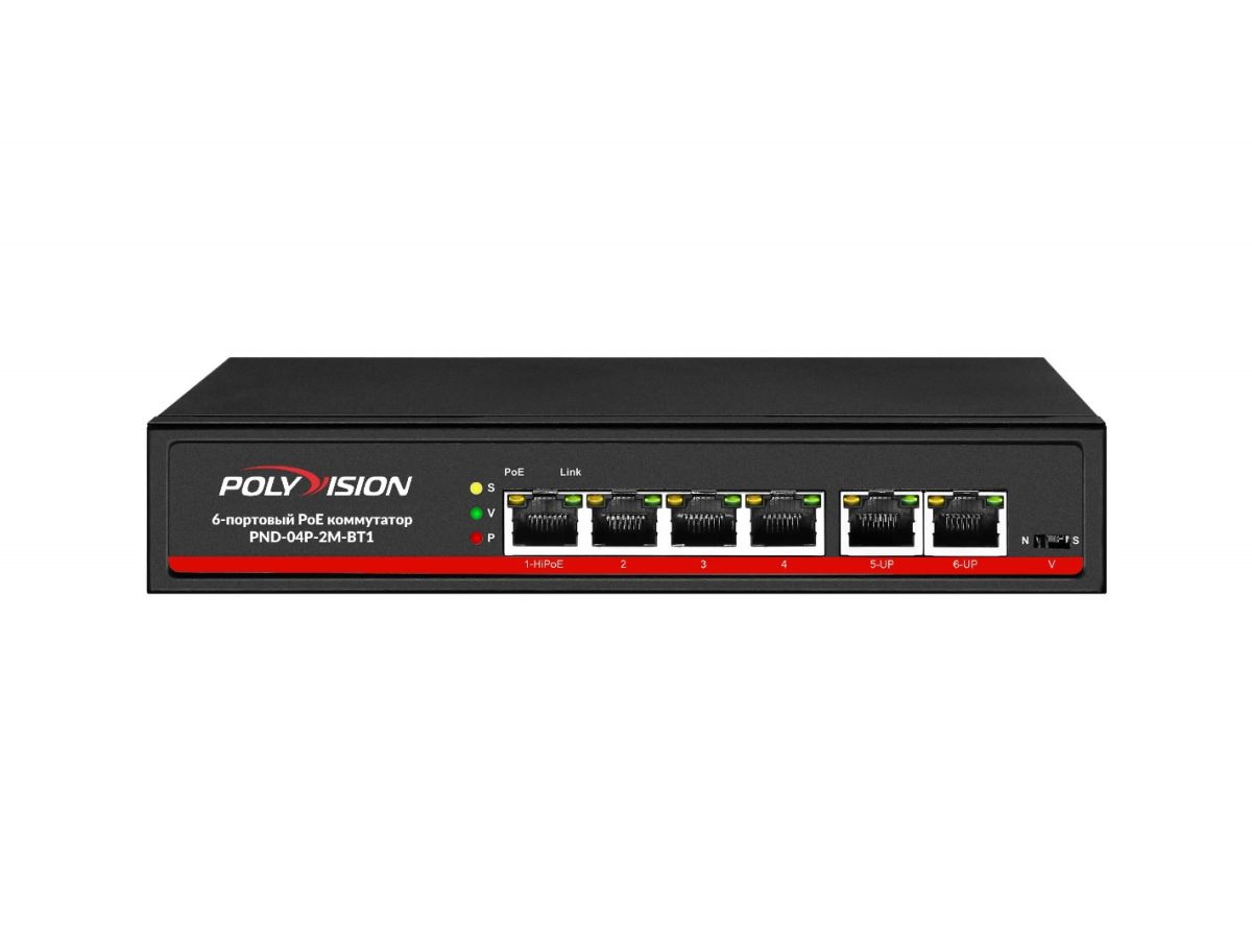 PND-04P-2M-BT1 (65W) 6-портовый неуправляемый коммутатор с функцией PoE; 4*10/100Base-TX PoE port(Data/Power); 2*10/100Base-TX uplink RJ45 port(Data); Полоса пропускания 1.6Гбит/с; MAX 48Вт (AC100-240В); Встроенный БП AC100~240В 50-60Гц 0.6A; Температура эксплуатации -10~+55°C; 5%~90% RH Без конденсата; Класс защиты IP30