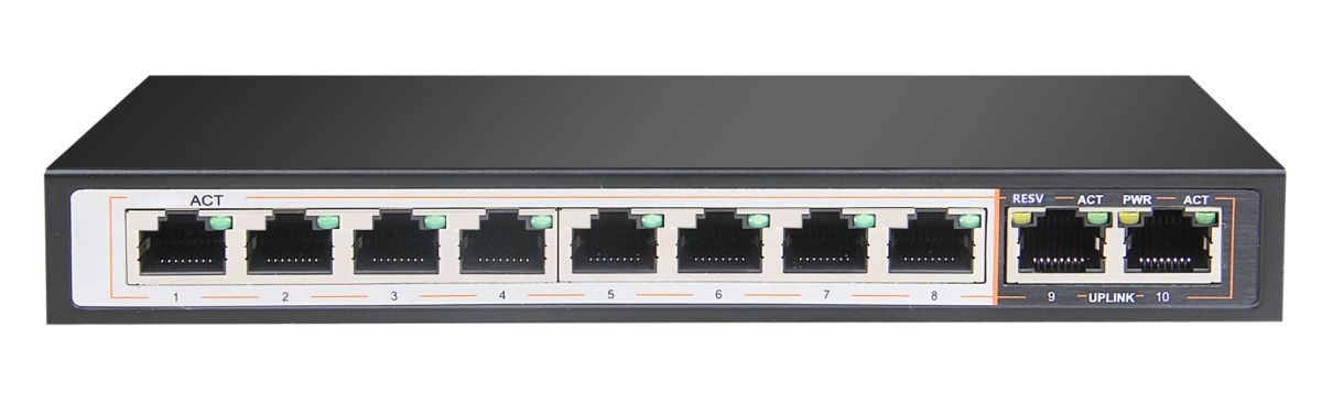 PND-08P-2G 10-портовый интеллектуальный PoE-коммутатор, 8 портов 10/100 Мбит/с PoE, 2 uplink порта 10/100/1000 Мбит/с, до30 Вт на порт, бюджет PoE 96Вт, дальность передачи питания до 250м, пропускная способность 5,6 ГБит/с; 4 режима работы (AI VLAN, AI Extend, AI Power, AI QoS)