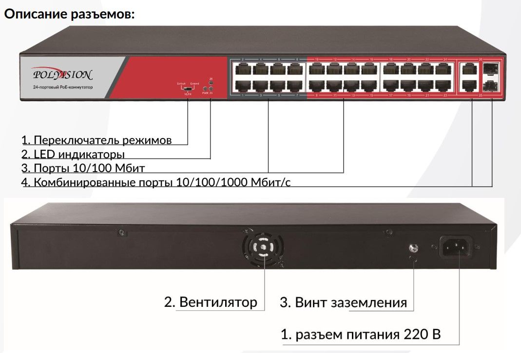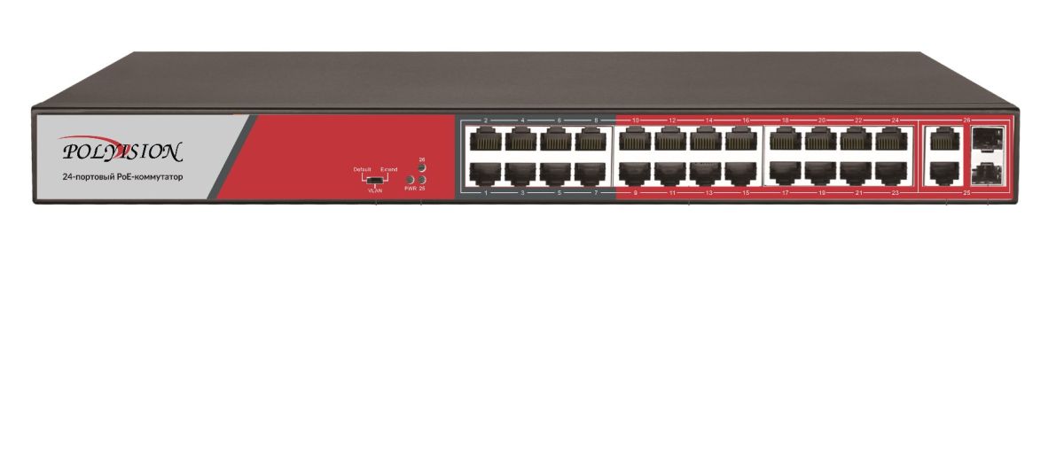 PND-24P-2G2F 26-портовый неуправляемый PoE-коммутатор, 24 порта 10/100 Мбит/с PoE, 2 порта 10/100/1000 Мбит/с, 2 gigabit SFP порта, до 30 Вт на порт, бюджет PoE 400Вт, крепление у 19" стойку, дальность передачи питания до 250м, пропускная способность 8,6 Гбит/с; 3 режима работы (Standart, VLAN, Extend)