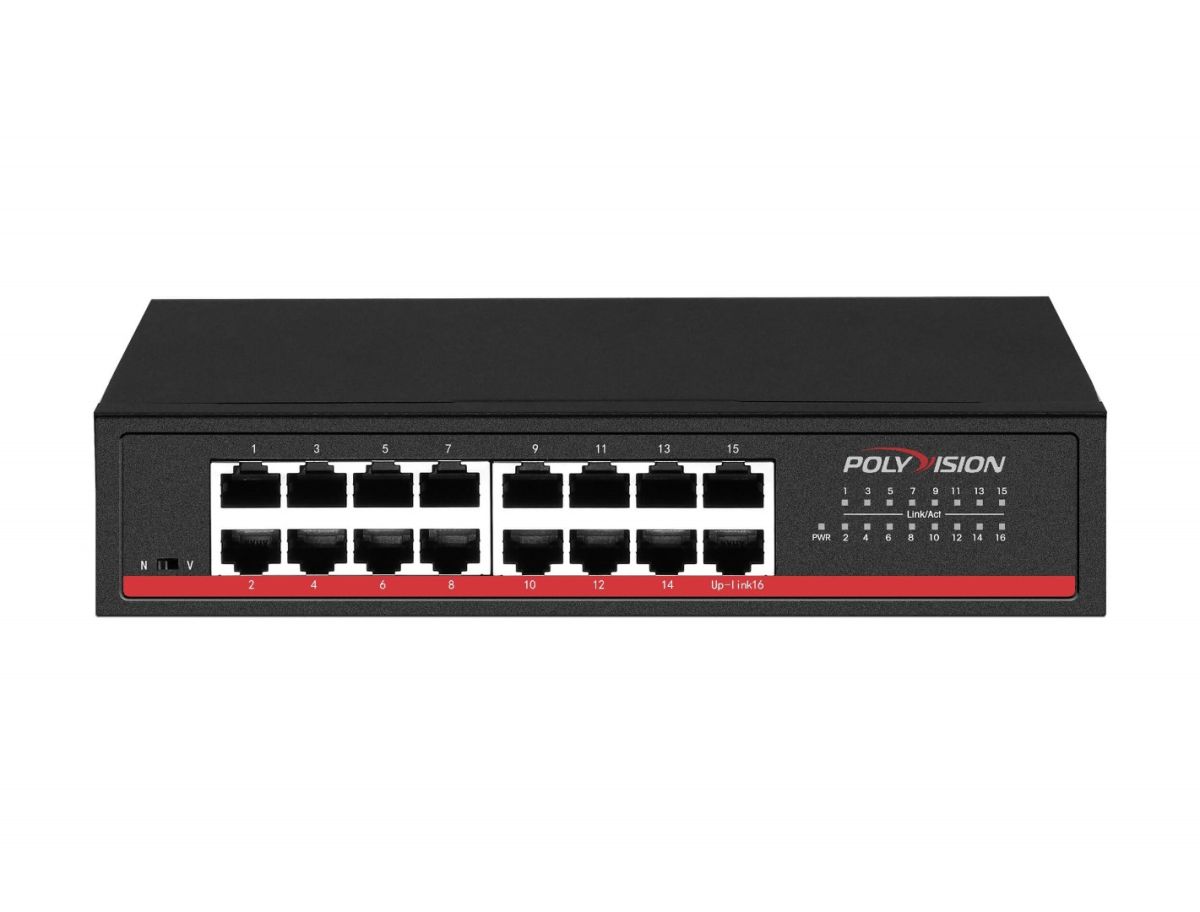 PND-M16M 16-портовый 100-мегабитный неуправляемый коммутатор с питанием 12В/220В; 16*10/100Base-TX RJ45 port(Data); Полоса пропускания 4.8Гбит/с; Встроенный БП AC100~240В 50-60Гц 1A/ питание DC12В1A (адаптер не входит в комплект); Температура эксплуатации -10~+55°C; 5%~90% RH Без конденсата; Класс защиты 3кВ 8/20us, IP30