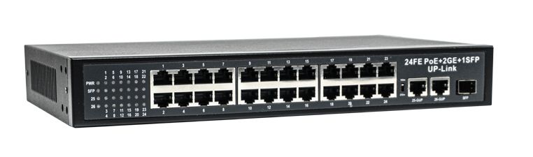 24 порта 10/100 Мбит/с RJ-45 PoE, 2 порта 10/100/1000 Мбит/с RJ-45 Uplink, 1 порт 10/100/1000 Мбит/с SFP Передача данных до 250м. PoE Бюджет до 300Вт, Контакты PoE 1/2(+), 3/6(-), АС 100~240 В, 50-60Гц, DC 52В, 570мА, встроенный блок питания Совместим с удлинителем PoE сигнала Optimus EM1260