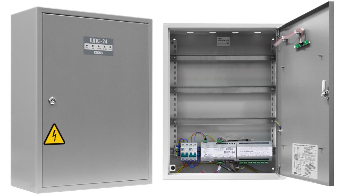каф для монтажа средств пожарной автоматики с креплением на DIN-рейку; 2 ввода питания; U-вх.150…253 В, U-вых.27.2±6 В, I-ном.2 А, I-макс.2.2 А, под два АКБ 12 В 17 А·ч; встроенный блок коммутации БК-24-RS485 (две изолированные линии интерфейса RS-485 для подключения к компонентам ППКП и ППКУП расположенным за пределами ШПС, одна линия RS-485 для подключения компонентов ППКП внутри ШПС; 7 выходов для подключения к приборам внутреннего интерфейса RS-485; 7 выходных каналов 24 В с индивидуальной защитой); IP41, t-раб.-10…+40°С, 650х500х220 мм. Возможность установки монтажного комплекта МК-1.